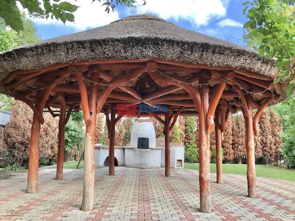 A nappaliból teraszajtón juthatunk ki a kert hátsó részére, ahol először is a közvetlen teraszra érkezünk. Találunk még egy nádfedeles kerti kiülőt, és egy fantasztikus kemencét is, a kert további részein.