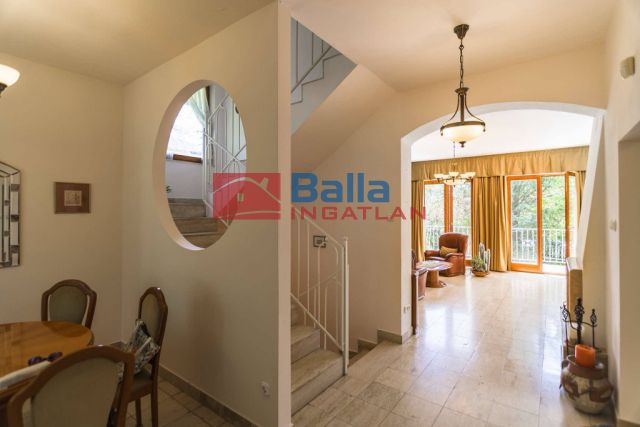 FOR SALE: In Budapest 2/A, Pesthidegkut, in a quiet side street free from through traffic, on a fully serviced 578 sqm plot, a continuously maintained, charming three-storey bourgeois family house with a perfect layout of 218 sqm gross. It offers a living room with panoramic terrace, dining area, separate fully equipped kitchen, guest WC, 3 bedrooms, 2 bathrooms, walk-in wardrobe room, double garage, separate workshop, boiler room, laundry room.