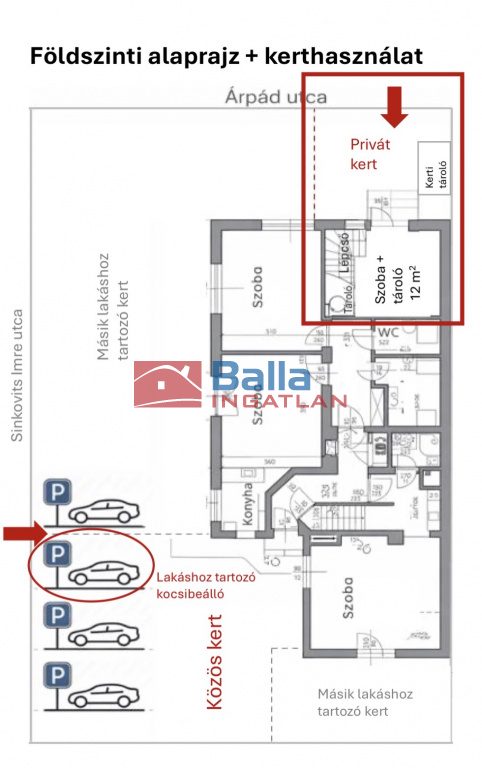A saját kert mellett a telken belül egy autóbeálló is tartozik hozzá, ami kötelezően megvásárolandó a lakással együtt (ára 6 millió Ft).