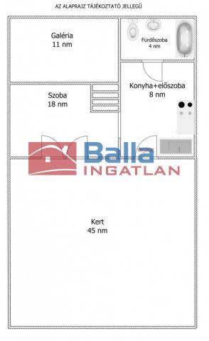 A lakásban 1 szoba (18 nm+11 nm fekvő galéria), konyha+étkező előszoba (8 nm), fürdőszoba+WC (4 nm), és saját használatú kert (kb. 45 nm) található.