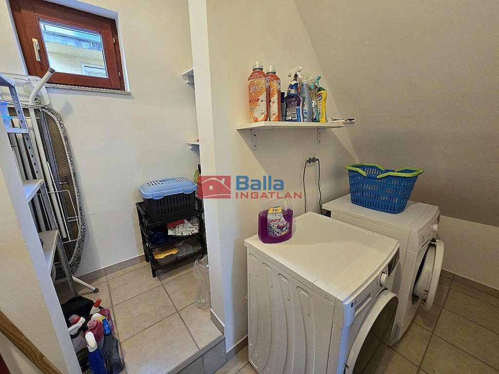 A házhoz 20 m2 PINCE tartozik, itt található a gépészet, a gázkazán és vegyestüzelésű kazán, valamint egy 200 literes meleg víz tároló. Ezek a tetőtéri lakást is ellátják. Tűzifa tároló is itt található.