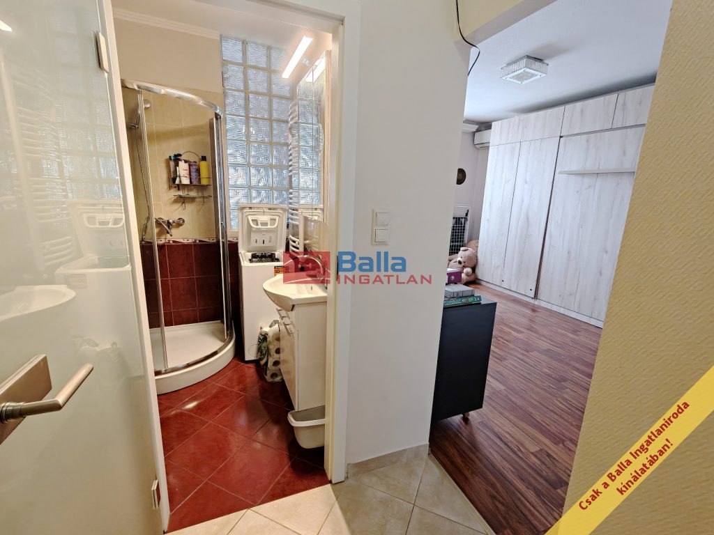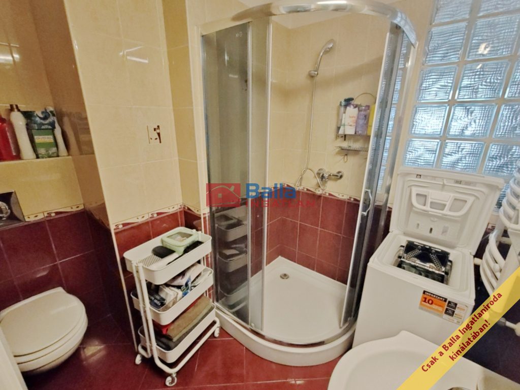 • Fürdő: Praktikus zuhanyzós fürdőszoba toalettel. Az üvegtégla falmegoldásnak köszönhetően a konyha felől természetes fény is érkezik a helyiségbe.