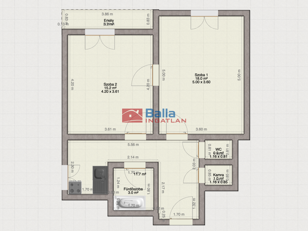 - Elrendezés: Előszoba, 2 tágas szoba, konyha, fürdőszoba és egy praktikus kamra.