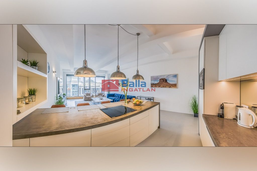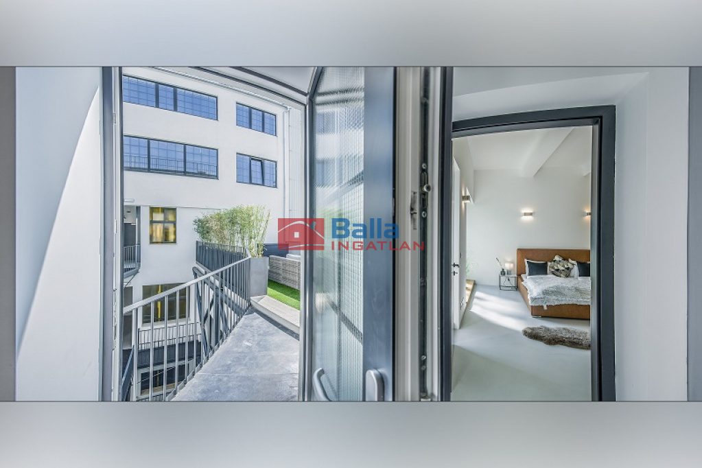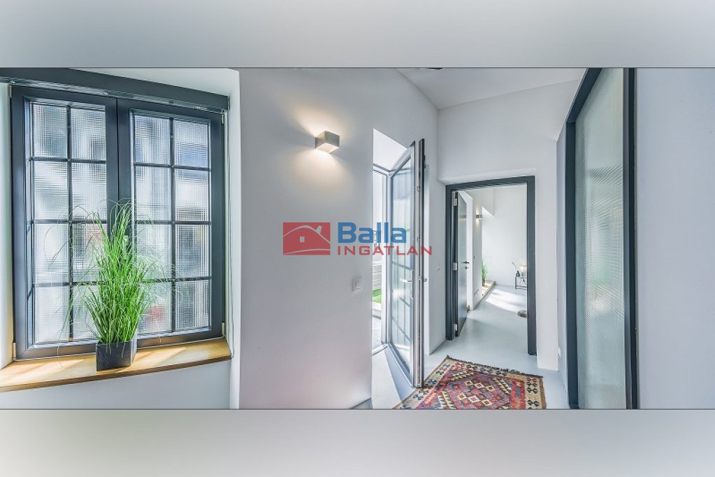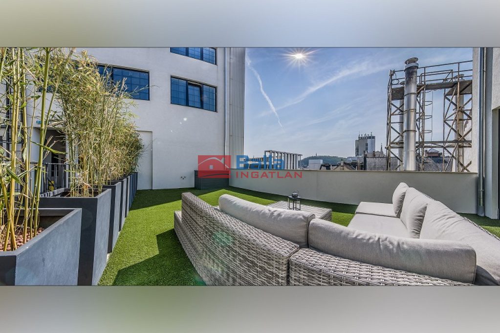 Az eladó ingatlan egy hatalmas nappali, konyhából, két tágas fürdőszobából walk-in zuhanyzóval és gardróbbal, egy hálófülkéből, valamit nagy méretű hálószobából áll, amelyből kijuthatunk a 42 m2-es teraszra, ahonnan csodálhatjuk a Gellért-hegyet. A lakás különlegessége a közel 5 méteres faltól-falig húzódó ablak, ahonnan a belvárosra láthatunk rá, a hatalmas belső terek és az osztott, fémkeretes ablakok, ajtók, amelyekkel elválasztják ezt a teret.