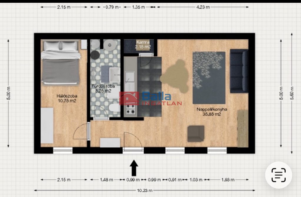 Jelenlegi beosztása nappali konyhával és kamra, előtér, amelyből nyílik a fürdőszoba és a hálószoba.