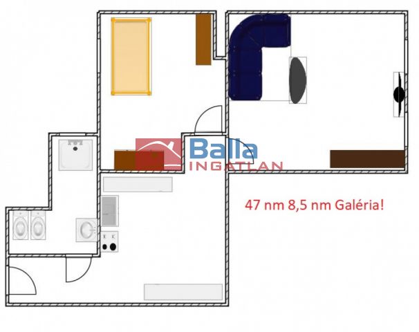 Az elrendezés praktikus: az előszobából nyílik a konyha és a fürdőszoba, a konyhából pedig két szoba érhető el. A nappali tágas és napfényes, a hálószoba felett pedig 8,5 nm-es galéria található, amely lenyitható létrán közelíthető meg.