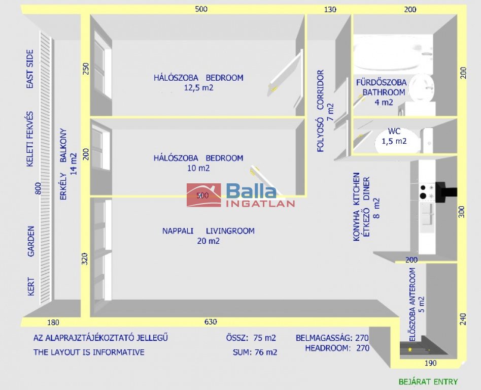 Belépve a lakásba az 5 m2-es előszobából a nappaliba érkezünk amely 20 m2. Innen nyílik a ház egyik legnagyobb erkélye 14 m2 területű. Innen nagyszerű kilátás nyílik az ápolt kertre ahol mindig csend uralkodik. A nappaliból jutunk be a kisebbik hálószobába 10 m2. Szintén a nappali része az amerikai konyha étkezővel 7 m2. A közlekedőből nyílik jobbra a külön wc és a kádas fürdőszoba 4 m2, valamint balra léphetünk be a nagyobbik hálószobába, amely 12 m2.