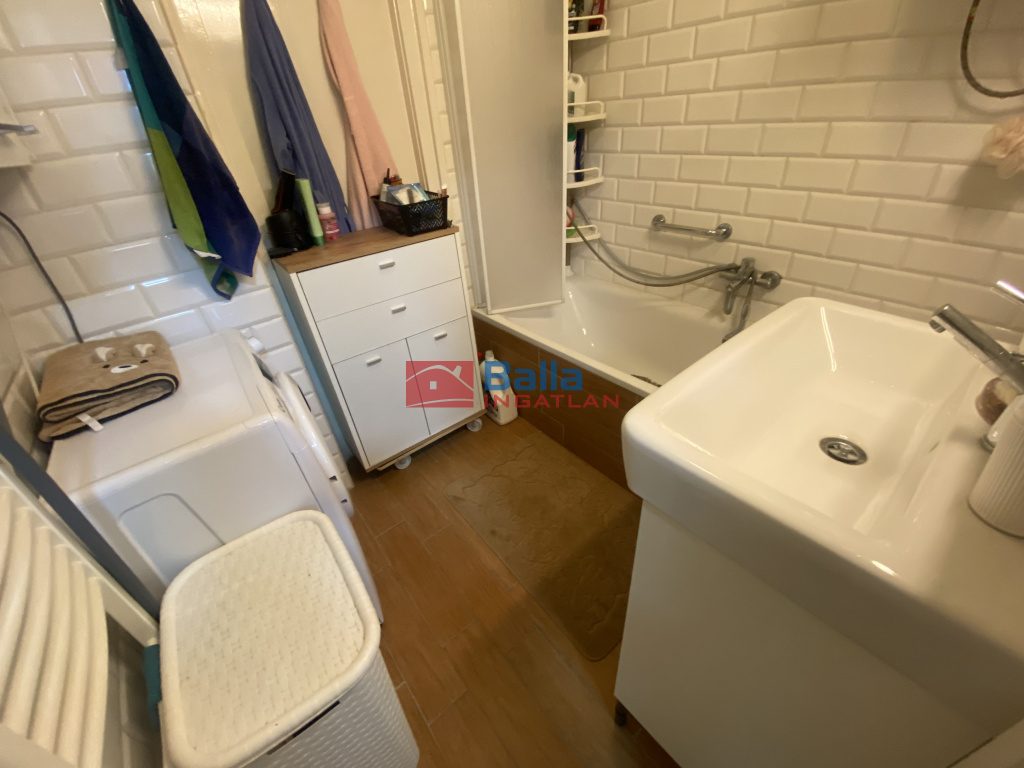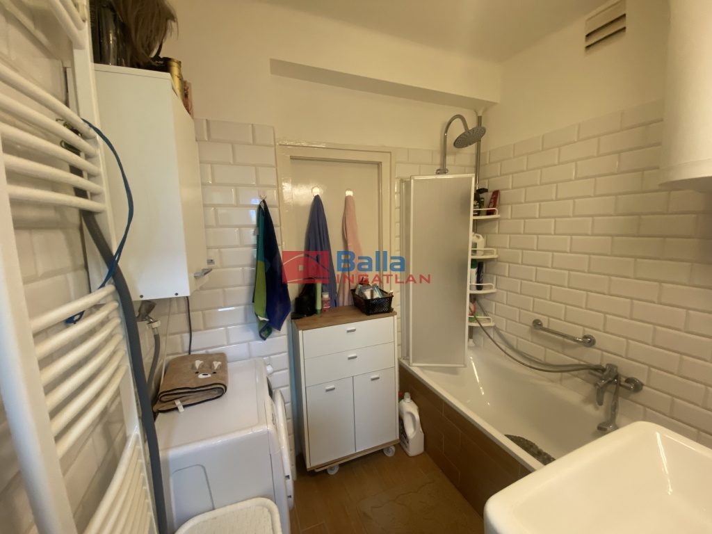 - kádas fürdőszoba, fali zuhanypanellel, törülközőszárítós radiátorral,modern burkolattal, mosógép kiállással,