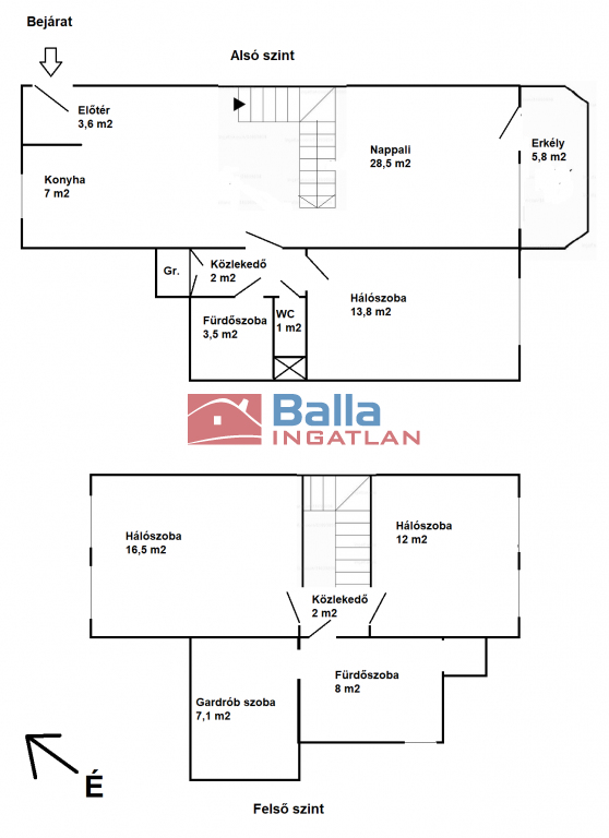 A nappaliból induló kényelmes lépcső egy új dimenzióba visz: a felső szinten két külön nyíló hálószoba, egy fürdőszoba káddal, zuhanyzóval, dupla mosdóval és WC-vel, valamint egy gardróbszoba vár. Itt mindenki megtalálja a saját kis zugát, legyen szó pihenésről, munkáról vagy elvonulásról.