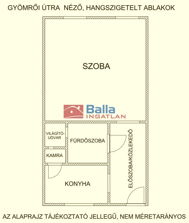 A világos konyhához kamra kapcsolódik, a fürdőszoba jól átszellőztethető, az előtér praktikusan bútorozható, a nagyméretű szoba hálófülkéssé alakítható.