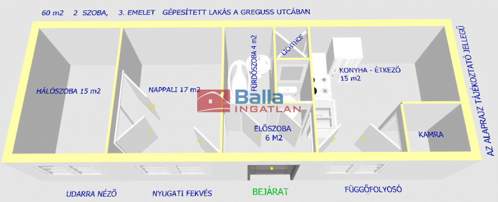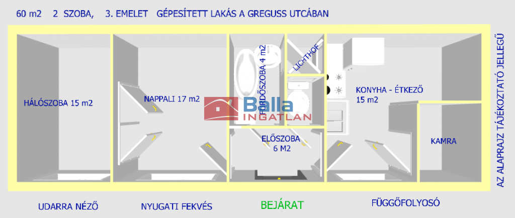 Belépve a lakásba balra találhatók a világos szobák, szemben az igényes fürdőszoba és a külön wc, jobbra a nagy konyha az étkezővel és a kamrával. Mindenhol műanyag nyílászárókra cserélték a régieket.