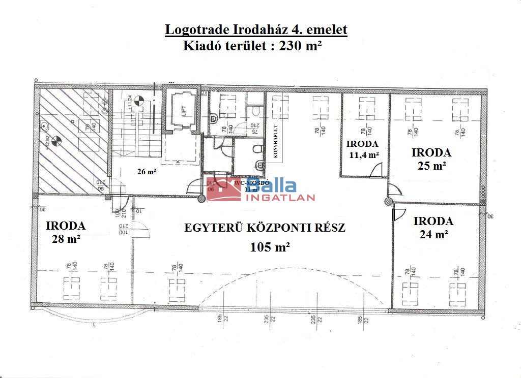 A kiadó iroda 230 nm, 8 euró/ m2 + Áfa a havi bérleti díja, az üzemeltetési költség 4 euró/m2/hó, a rezsi pedig 4 euró/m2/hó.