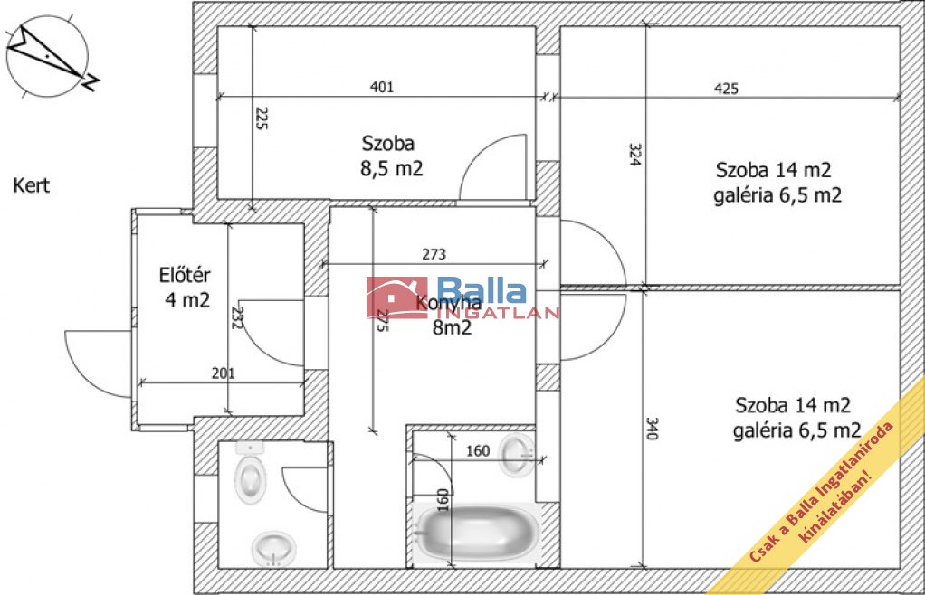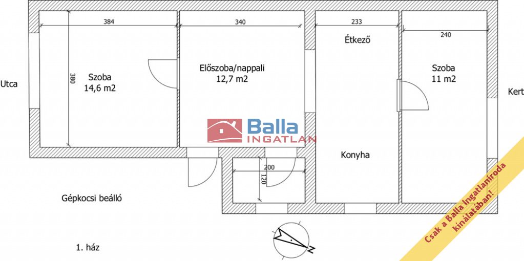 Alapterülete 51 m2, 2 szoba étkezős. A tágas előtérből nyílik a nagyobb szoba, a fürdőszoba és az étkezős konyha. Az épület másik végében, a kert felőli oldalon található a kisebb hálószoba. Az épület az ötvenes években épült, falazata kis méretű tégla és kis helyen vályog. Szobái laminált parkettával burkoltak, minden más járólapos. Az ablaka hőszigetlelt, műanyag.