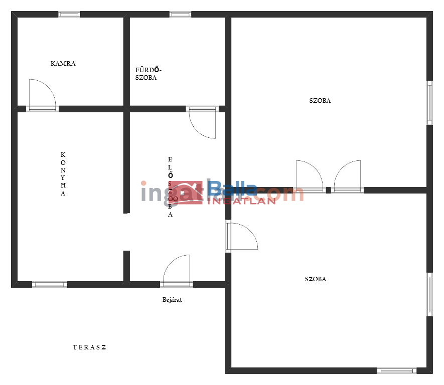 két egybenyíló szoba, ablakos konyha, ablakos fürdőszoba WC-vel, ablakos kamra, előszoba és terasz, fűtés: 3 db elektromos hőtárolós kályha, melegvíz: villanybojler éjszakai árammal