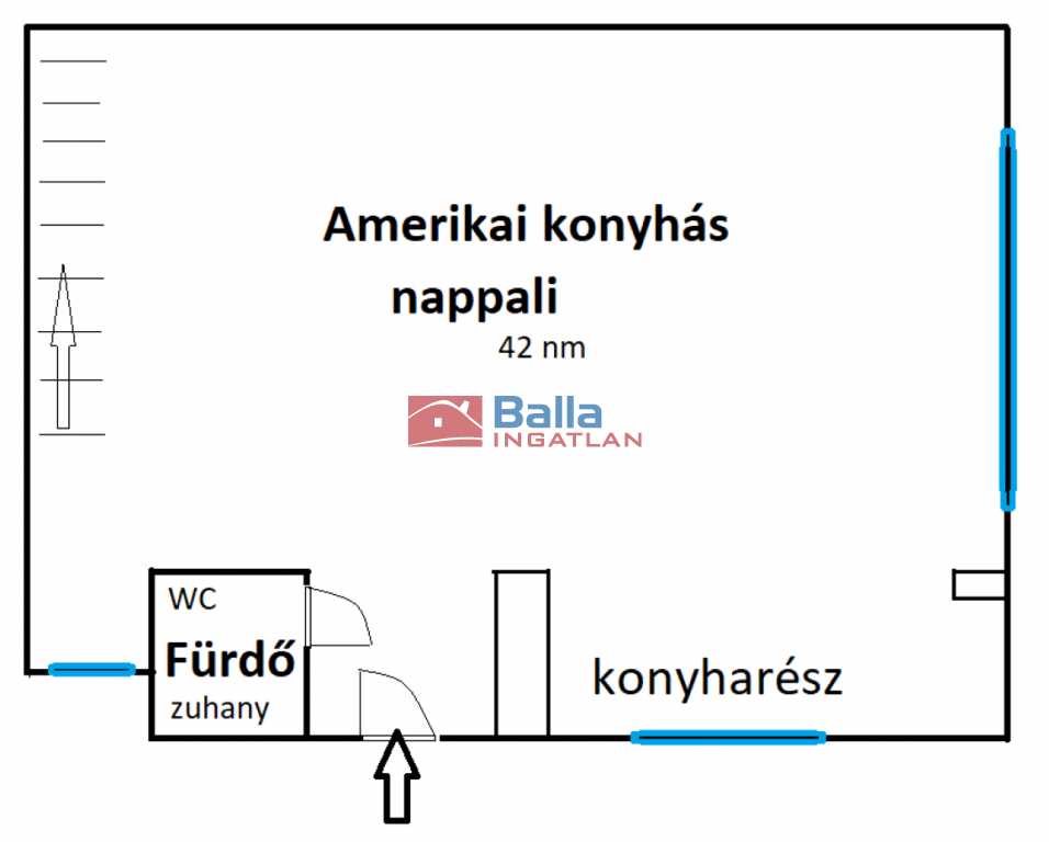 ➡ Alsó szint: amerikai konyhás, nagy méretű nappali, előtér, zuhanyzós fürdőszoba
