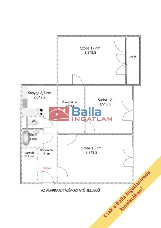 Egyéb tulajdonságok: tehermentes, azonnal költözhető, külön étkező, külön wc, gardróbszoba, loggia (3 m²), utcai parkolás