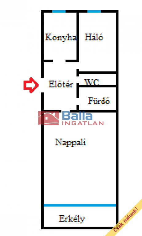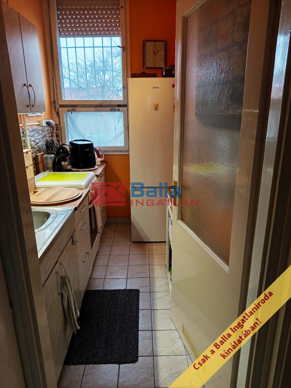 Praktikus elrendezés: Ablakos konyha, valamint különálló fürdőszoba és WC.