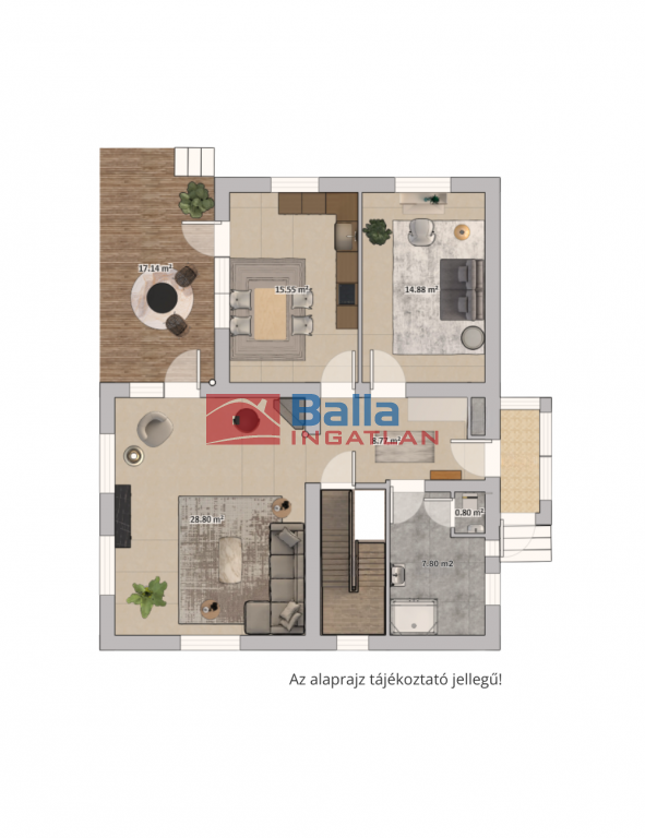 A felső két szintes lakótér (a tetőtéri részekkel együtt 154 m², anélkül 135,8 m²) .