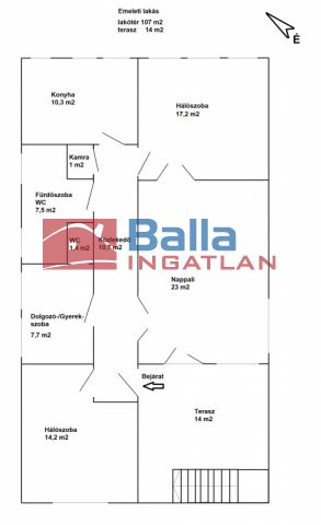 Az emeleti lakás 107 m²-es lakóterülettel és egy 14 m²-es, déli és nyugati irányból nyitott terasszal rendelkezik. A nappali + 3 hálószobás elrendezés ideális családoknak, alkotóknak, vagy azoknak, akik szeretik, ha van helyük lélegezni. A konyha különálló, étkezős kialakítású, így a nappali valóban a pihenés és a közös pillanatok tere maradhat.
