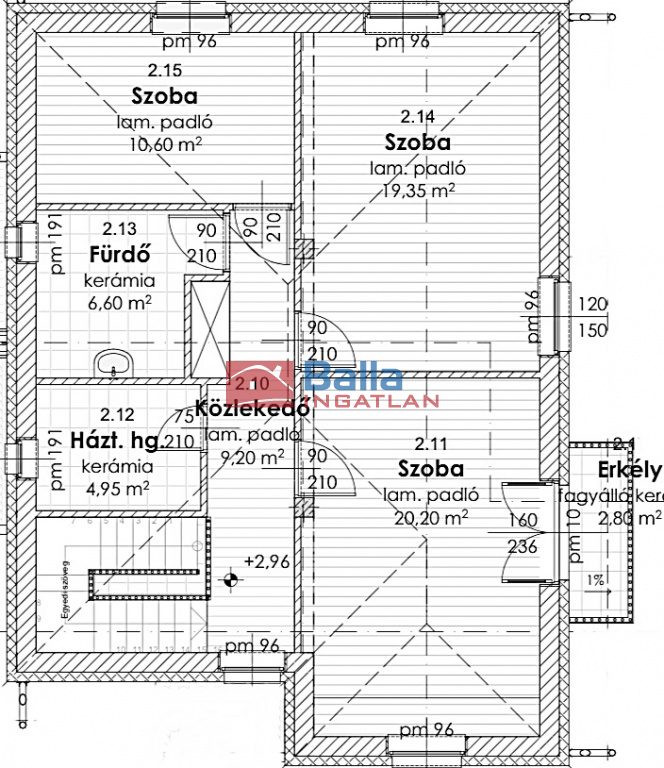 Egyéb tulajdonságok: külön wc, erkély (3 m²), terasz (14 m²), zárt autóbeálló, utcai parkolás