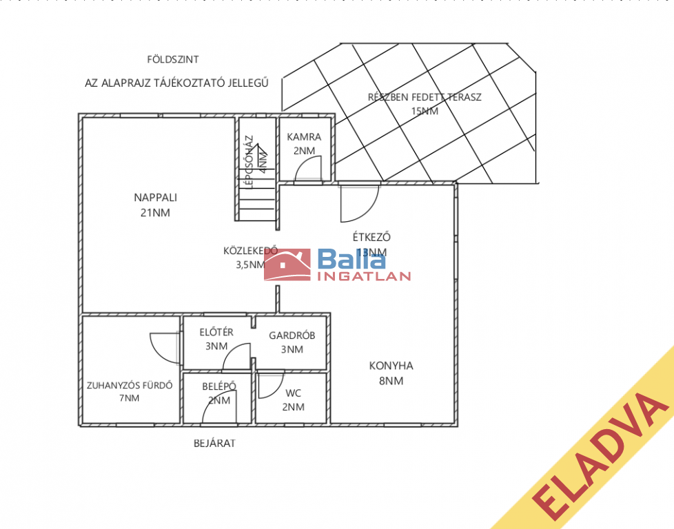 • Földszinten: előszoba, zuhanyzós fürdő, külön WC, kamra, konyha–étkező rálátás a nappalira, közvetlen kijárattal a 16 nm-es teraszra