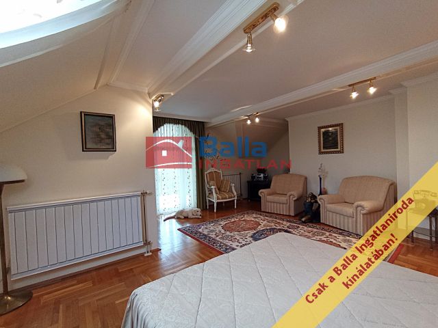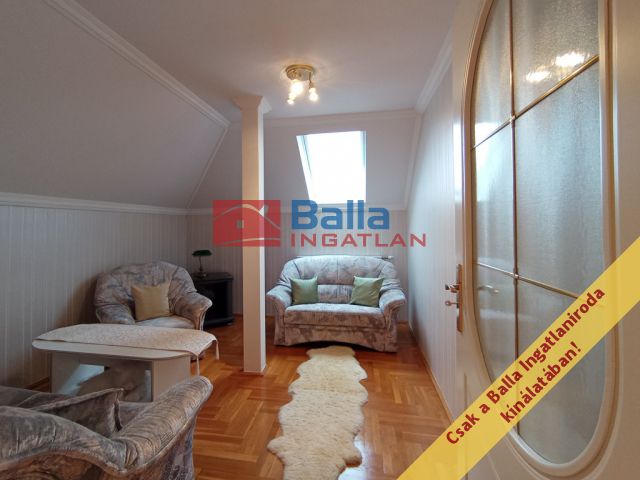 A felső szintre kényelmes épített lépcső vezet: a két szobán kívül fürdőszoba, külön WC, járható szekrényként használható, akár hobbiszobává alakítható pakolós padlástér kialakítású. A 29 nm-es szoba utcára néző, 12 nm-es erkélyéről páratlan kilátás nyílik a távoli Liszt Ferenc repülőtérre.