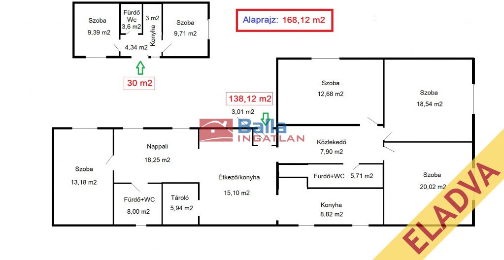 168,12 m2 hasznos alapterület, 2 épület, 5+2 szoba.