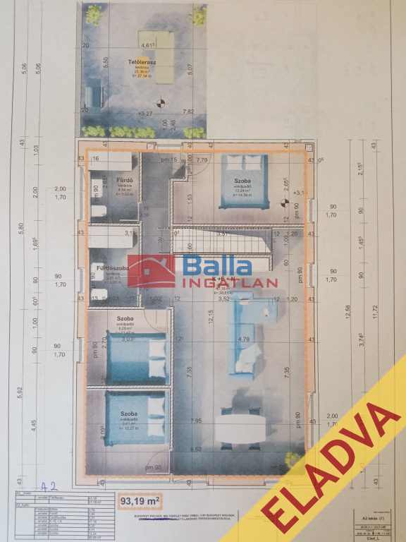 -A2 lakás 93m2+23.36m2 Tető Teraszt ( Nappali-konyha + 3 háló + 2 fürdő + Tető Terasz 41nm. - 120.6mFt )