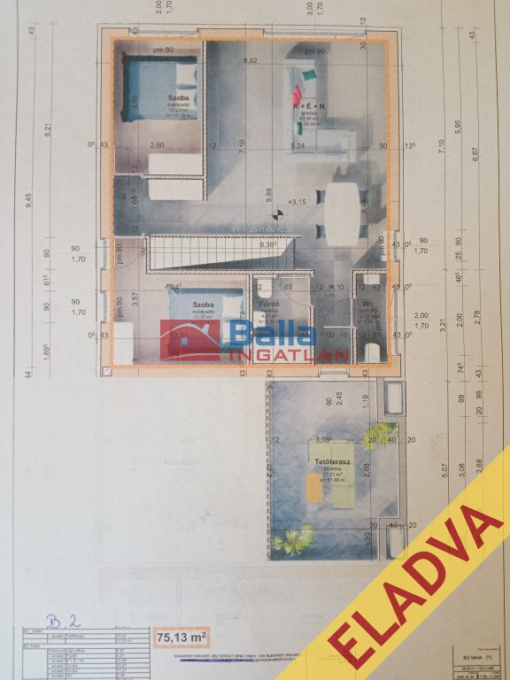 -B2 lakás 75.13m2+17.21m2 Tető Terasz ( Nappali-konyha + 2 háló + fürdő + vendég Wc + Tető terasz 17nm. - 99.99mFt )
