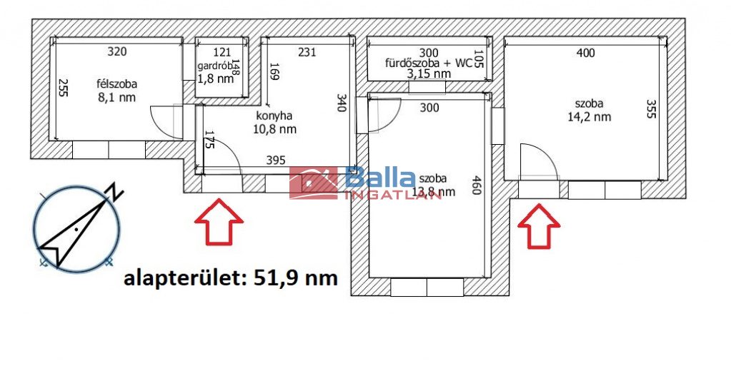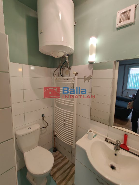 A tehermentes, akár azonnal birtokba vehető ingatlan a hátsó lakásban található, ami 2+1 félszobás, és 52 nm-es. Az ingatlannak két bejárata is van. A konyhája ablakos, a fürdőszobában zuhanyzó lett kialakítva, itt található a toalett is. Minden fogyasztás önállóan mérhető. A fűtésről gázcirkó gondoskodik, a használati melegvizet villanybojler biztosítja.