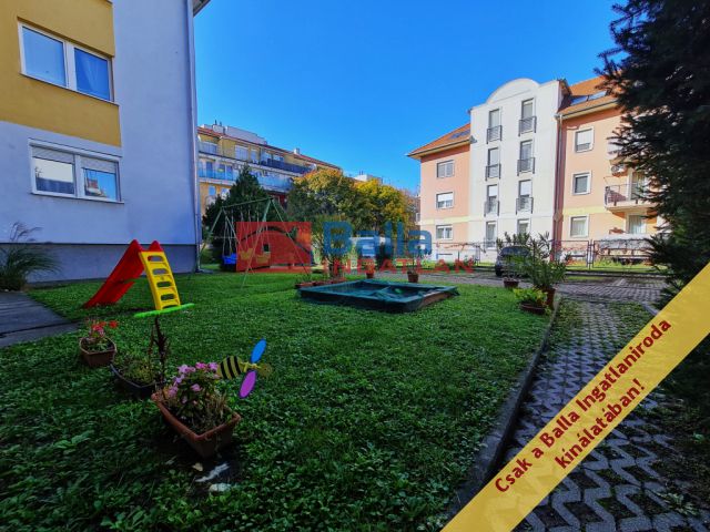 Ez a jó állapotú, 55 m²-es, nappali + 2 hálószobás lakás a lakópark magasföldszintjén található, ahová mindössze néhány lépcsőfok vezet fel. A magasság épp ideális: az ablakokon nem lát be senki, mégis könnyen megközelíthető. A lakás egyetlen ablaka sem néz az utcára – minden nyílászáró a belső kert felé fordul, így a nyugalom garantált.