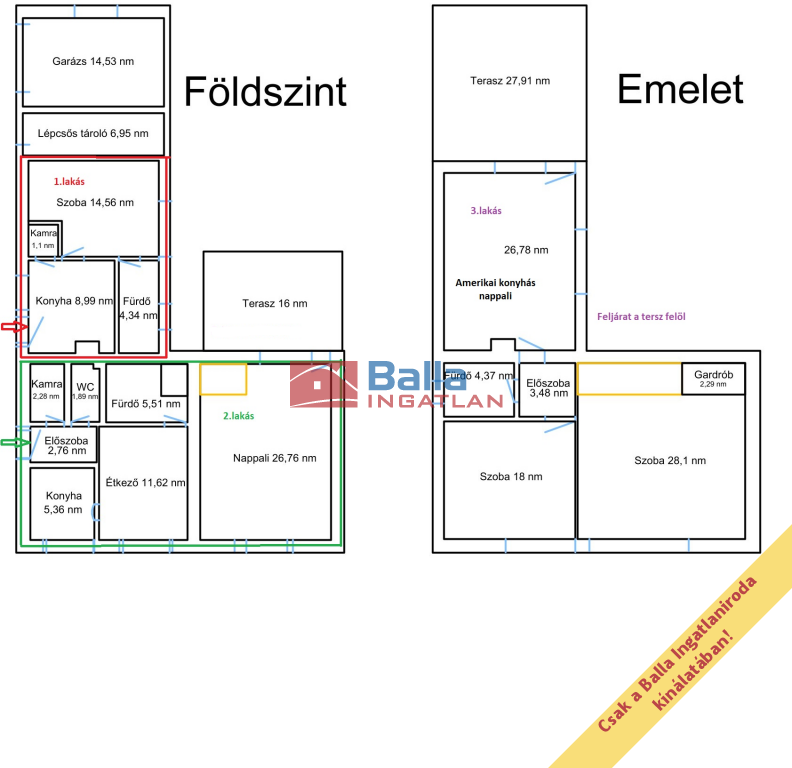Három külön lakás lett kialakítva, külön bejárattal: