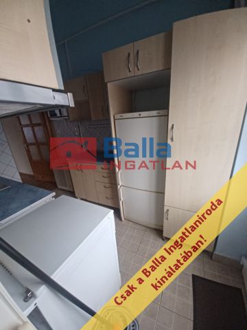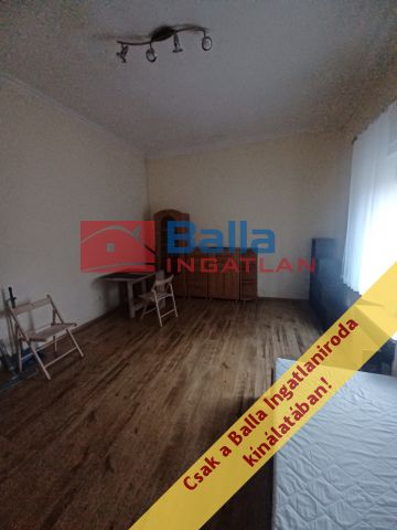 A szoba szalagparkettás, az utcára nyílik, ablaka műanyag,a konyha berendezése beépített, van benne hűtő, mosógép, gáztűzhely.