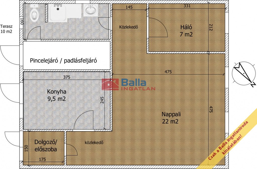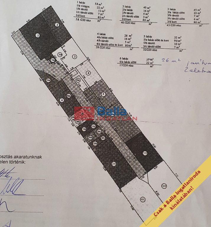 Az eladandó ingatlan a bejárattól balra az első lakás, mely 58 m2-es, tartozik hozzá egy terasz, saját tároló, saját, nagy pince és egy saját kertrész. A padlás az átlagosnál magasabb, így kényelmes felső szint is kialakítható.
