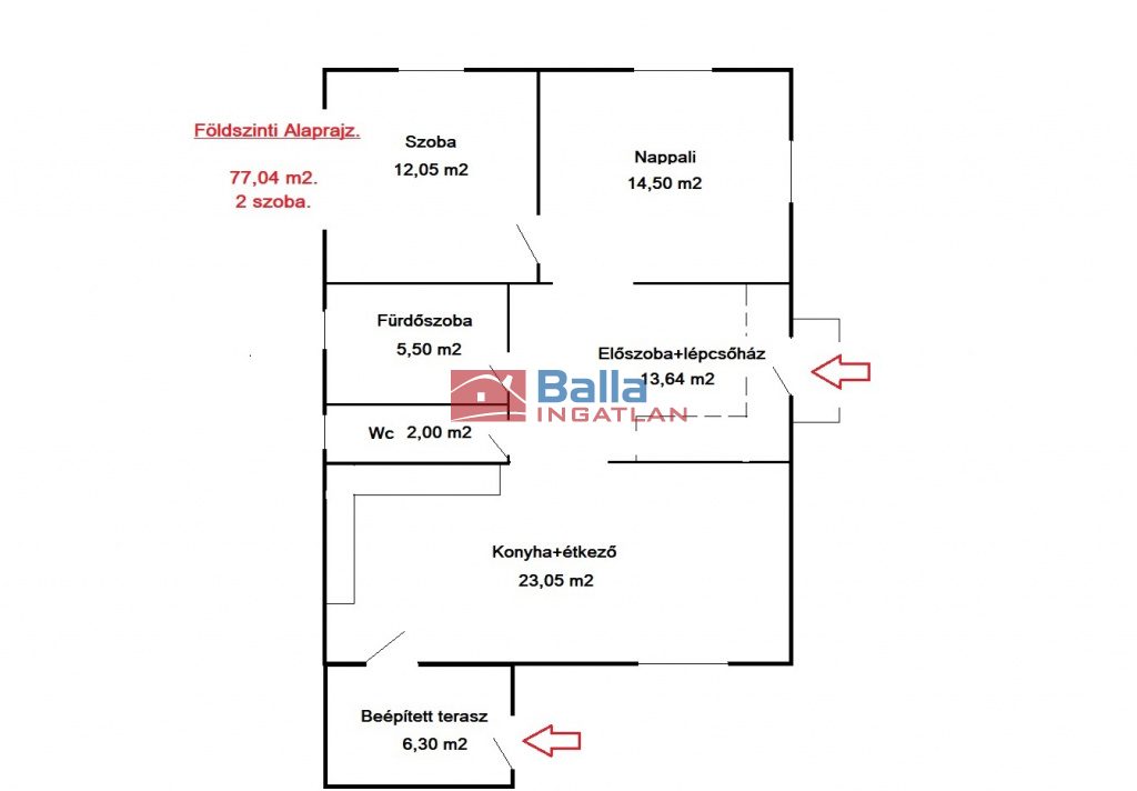 FÖLDSZINT: 77,04 m2. 2 szoba+beépített terasz,