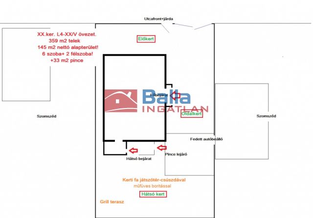 - középmagas kerítéssel és kiskapuval elválasztott, intim hátsókert,