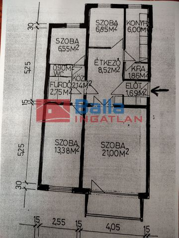 A lakás beosztása: közlekedő, konyha, étkező, 4 szoba, fürdőszoba, WC, erkély.
