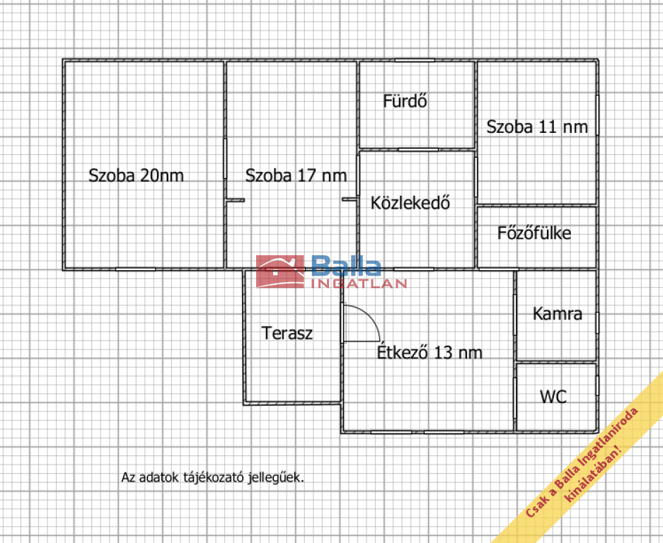 A ház egy szintes, elosztása: 3 szoba (20,17,11 nm), közlekedő, konyha, kamra, fürdőszoba, WC, terasz.