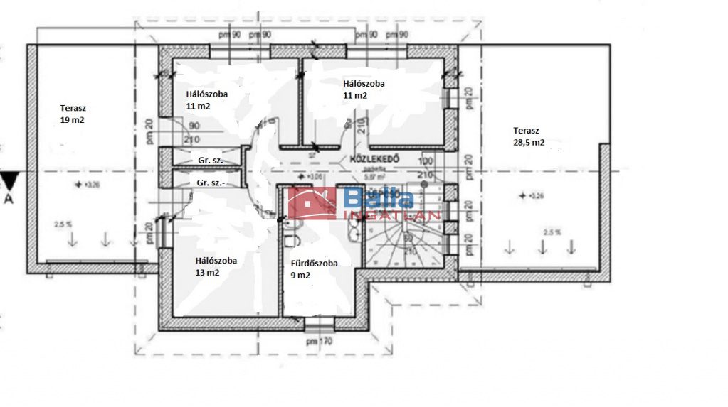 A másik három hálószoba mindegyike már az emeleten található. Ezen a szinten is van egy fürdőszoba, amelyben a WC is ki lett alakítva. Az emelet két oldalán egy-egy hatalmas, 19 és 25 m2-es teraszt, amely akár közösségi események lebonyolítására is elegendő helyet kínál, akár külön-külön is.