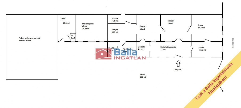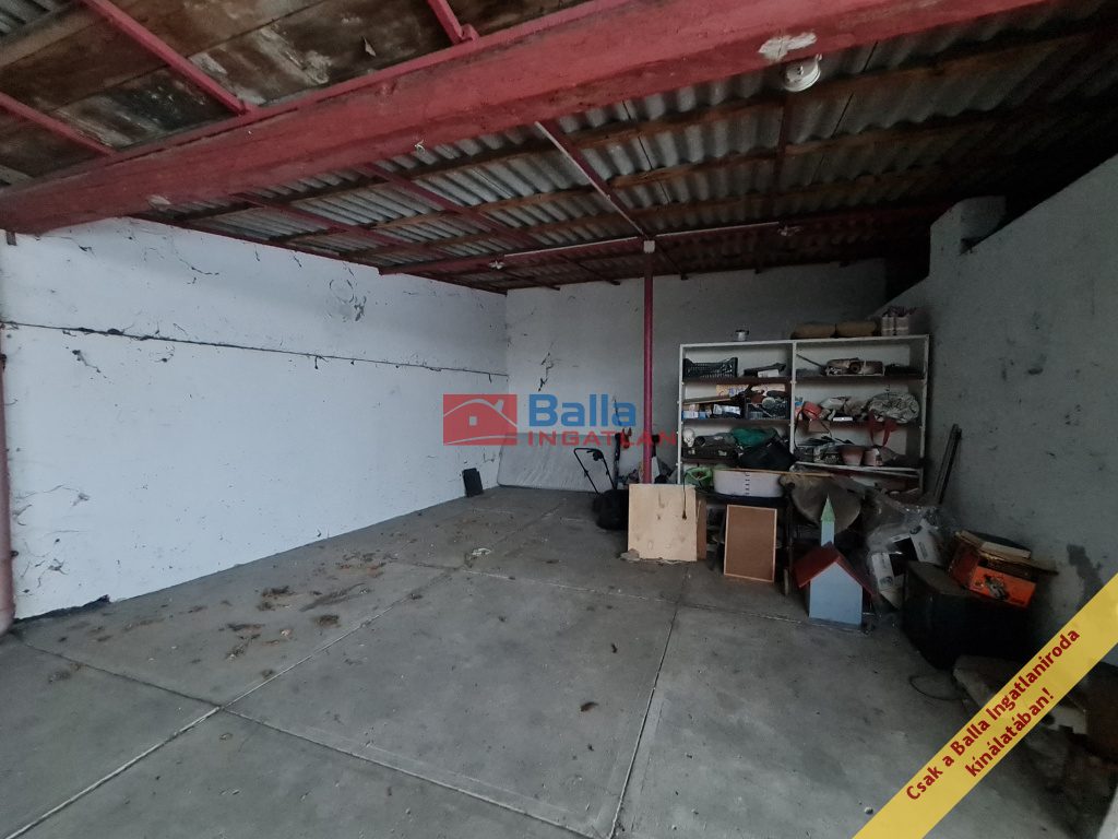 A melléképület 40 m²-es, szintén közművesített, innen érhető el a padlástér. A mögötte található 35 m²-es fedett raktár és az 50 m²-es fedett parkoló további értéket képvisel.