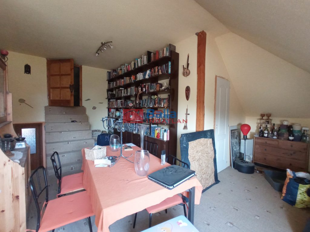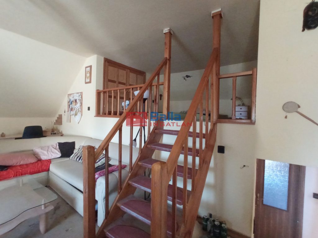 Innen szintén néhány lépcsővel feljebb található az egy légterű tetőtér, amely akár további szobák leválasztására alkalmas.