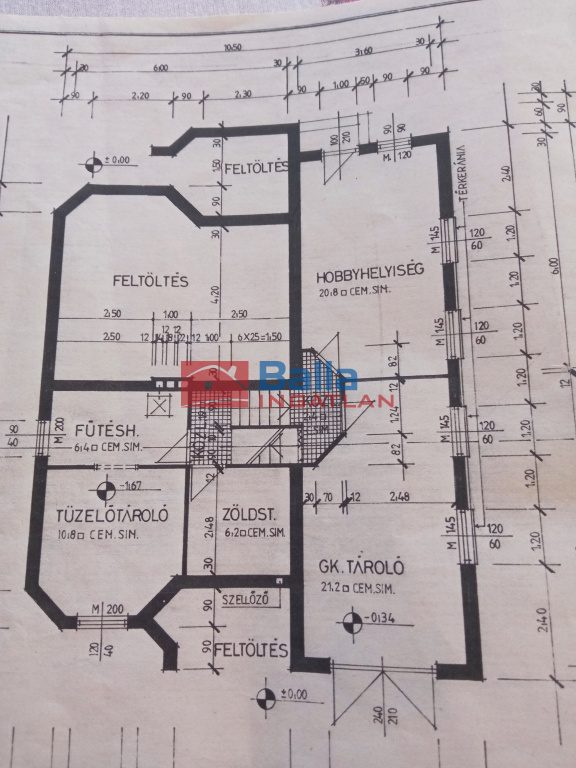 Innen vezet pár lépcső az alagsorba, ahol fűtött garázs, egy hálószoba fürdőszobával és teraszkapcsolattal, valamint tárolók és a vegyes kazán valamint a gázkazán helyisége található.