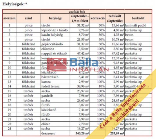 Extrák: kandalló, riasztó, vízlágyító, klíma, redőny, központi porszívó előkészítés, öntözőrendszer előkészítés, elektromos kapu, elektromos garázskapu