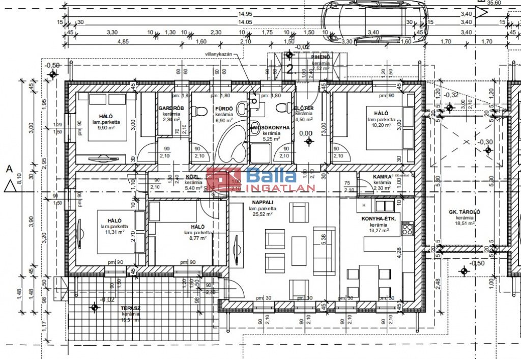 Egyéb tulajdonságok: tehermentes, lift, külön wc, gardróbszoba, kamra, terasz (7 m²), garázs