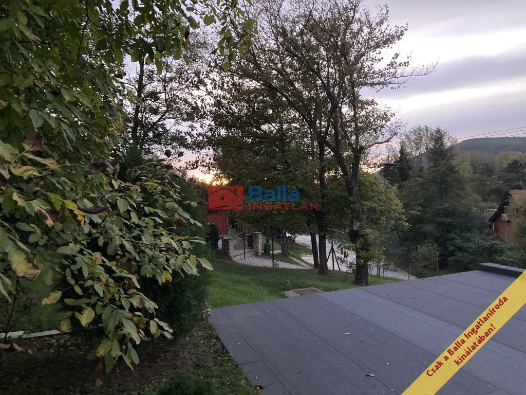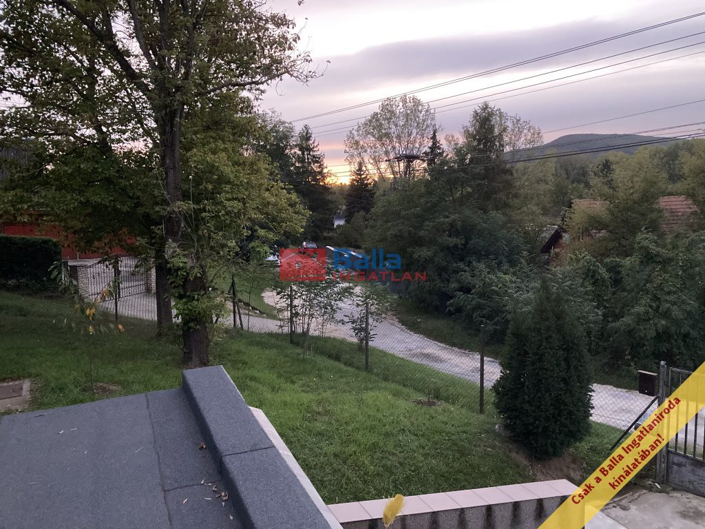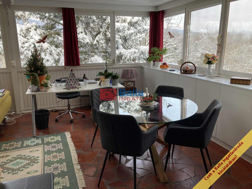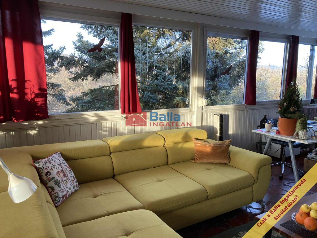 A felső szinten az egy légterű lakótér csendes és otthonos, az étkező-nappali panoráma jellegű, hőszigetelt ablakai egész nap világos, tágas térérzetet biztosítanak. A nappaliból gyönyörű kilátás nyílik a hegyekre és a zöld kertre. Egész nap csend és nyugalom várja leendő tulajdonosát. Itt található egy félszoba kinyitható kétszemélyes kanapéval, IKEA-s ruhásszekrénnyel. Mindkét szinten önálló zuhanyzós fürdőszoba WC-vel.