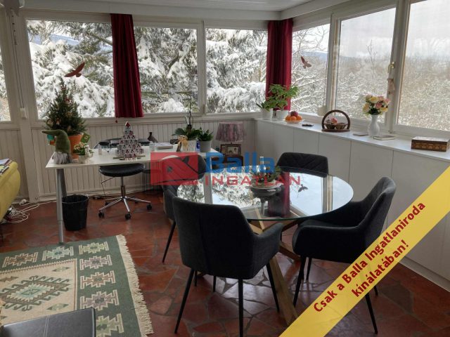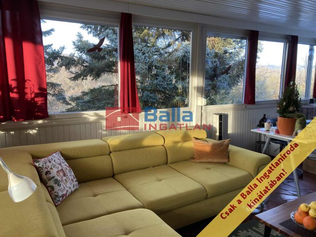 A felső szinten az egy légterű lakótér csendes és otthonos, az étkező-nappali panoráma jellegű, hőszigetelt ablakai egész nap világos, tágas térérzetet biztosítanak. A nappaliból gyönyörű kilátás nyílik a hegyekre és a zöld kertre. Egész nap csend és nyugalom várja leendő tulajdonosát. Itt található egy félszoba kinyitható kétszemélyes kanapéval, IKEA-s ruhásszekrénnyel. Mindkét szinten önálló zuhanyzós fürdőszoba WC-vel.