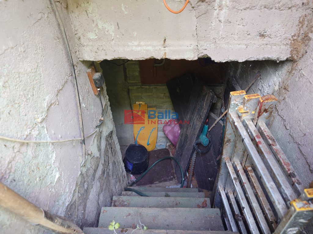 Az épület mögött egy lejáró a betonalapú pincébe. Az alapzat magas és stabil.