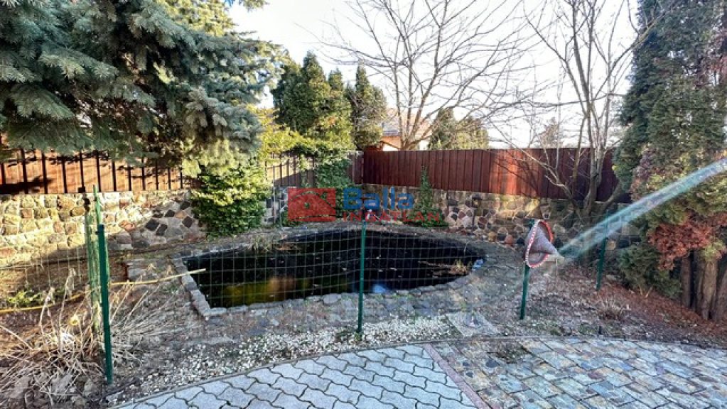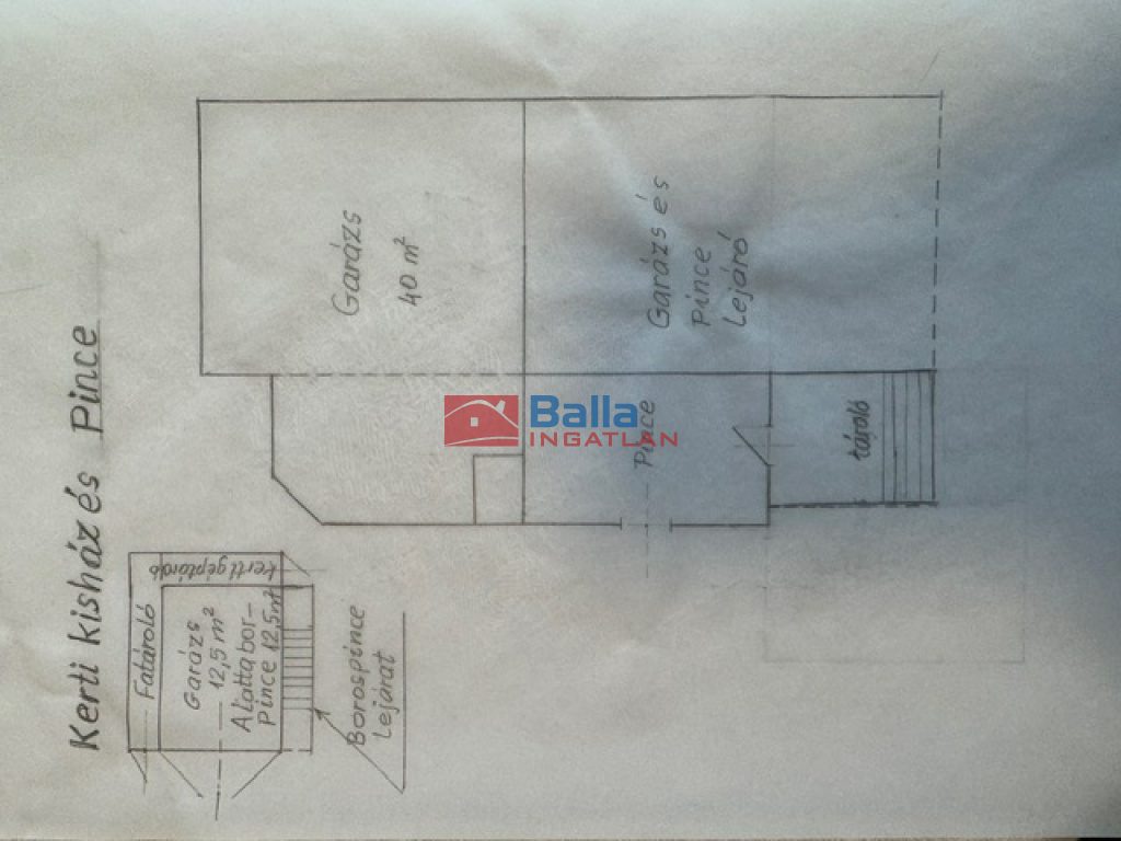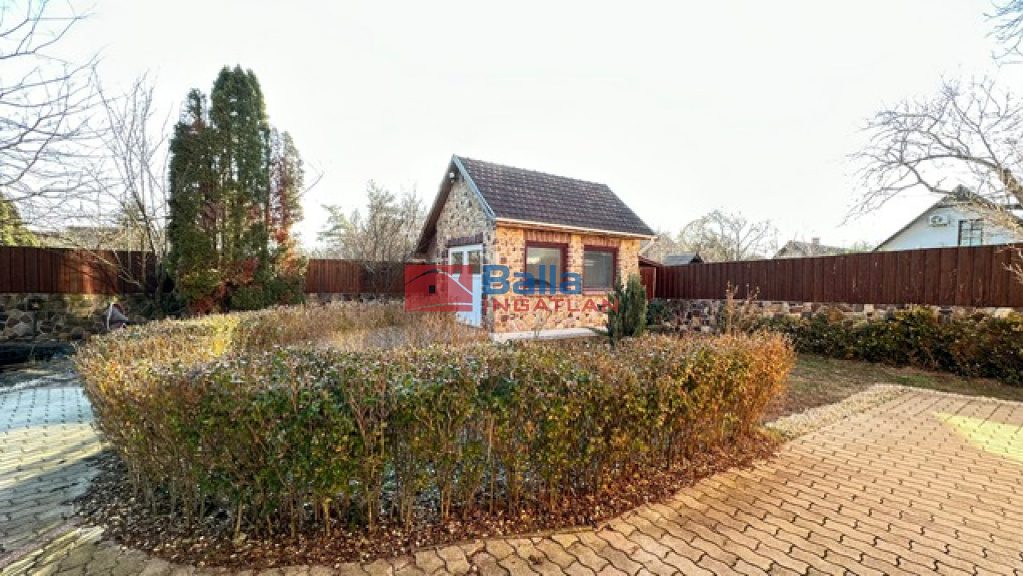 A pince szinten nagy méretű garázs, tároló és hobbiszoba is található. A kert gyönyörűen rendben tartott, kis halastó is található benne élő halakkal és szökőkúttal. Az udvaron található még egy fűtött kis ház, mely alatt borospince funkcionál, és még két kisebb tárolóhelyiség is a részét képezi.