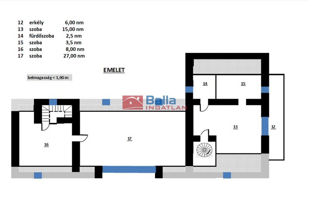 Emelet: 4 szoba, fürdőszoba-wc, erkély