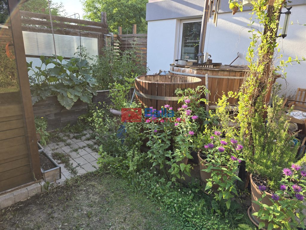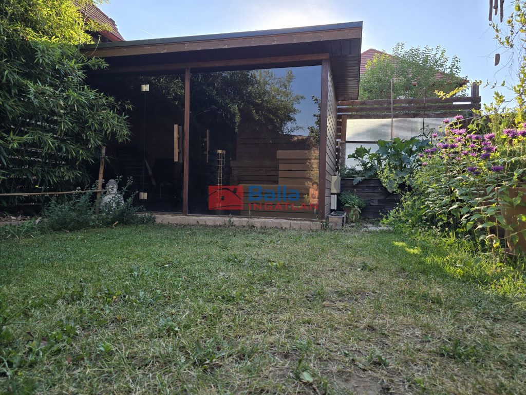 Az automata öntözőrendszerrel kialakított kert valódi különlegessége a különálló, prémium kivitelezésű szaunaház, benne 6 személyes finn elektromos szaunával, hidegvizes merülődézsával.